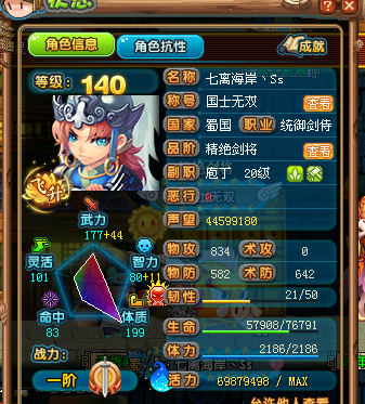 【QQ三国账号】 蜀国140级男剑士 武力44 智力11 韧性21 抗性50 50 42天书95级