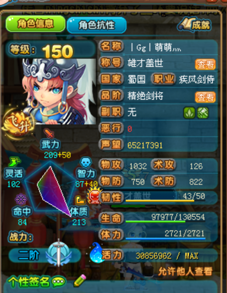 QQ三国SG4236 蜀国150级男剑士 武力50 智力40 韧性43 抗性50 50 50 满经络 天书136级