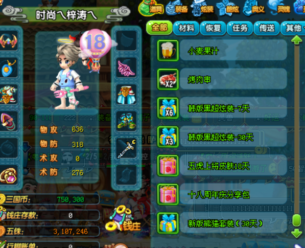 QQ三国SG1766巧借东风 100级剑豪 声望100W 活力450多万 武力10 抗性40-25-20 经验可以103级。 结拜13级 可打包 可单出 道具包30天歪嘴熊猫。18天五虎皮肤, 天使光环。秋阳发型 价睁眼闭眼套装。纯纯的爱。 15年圣诞套装。甜品武炫。魅影武炫。梦幻贝壳武炫。 激光剑 其他绝版武炫。技能全有,