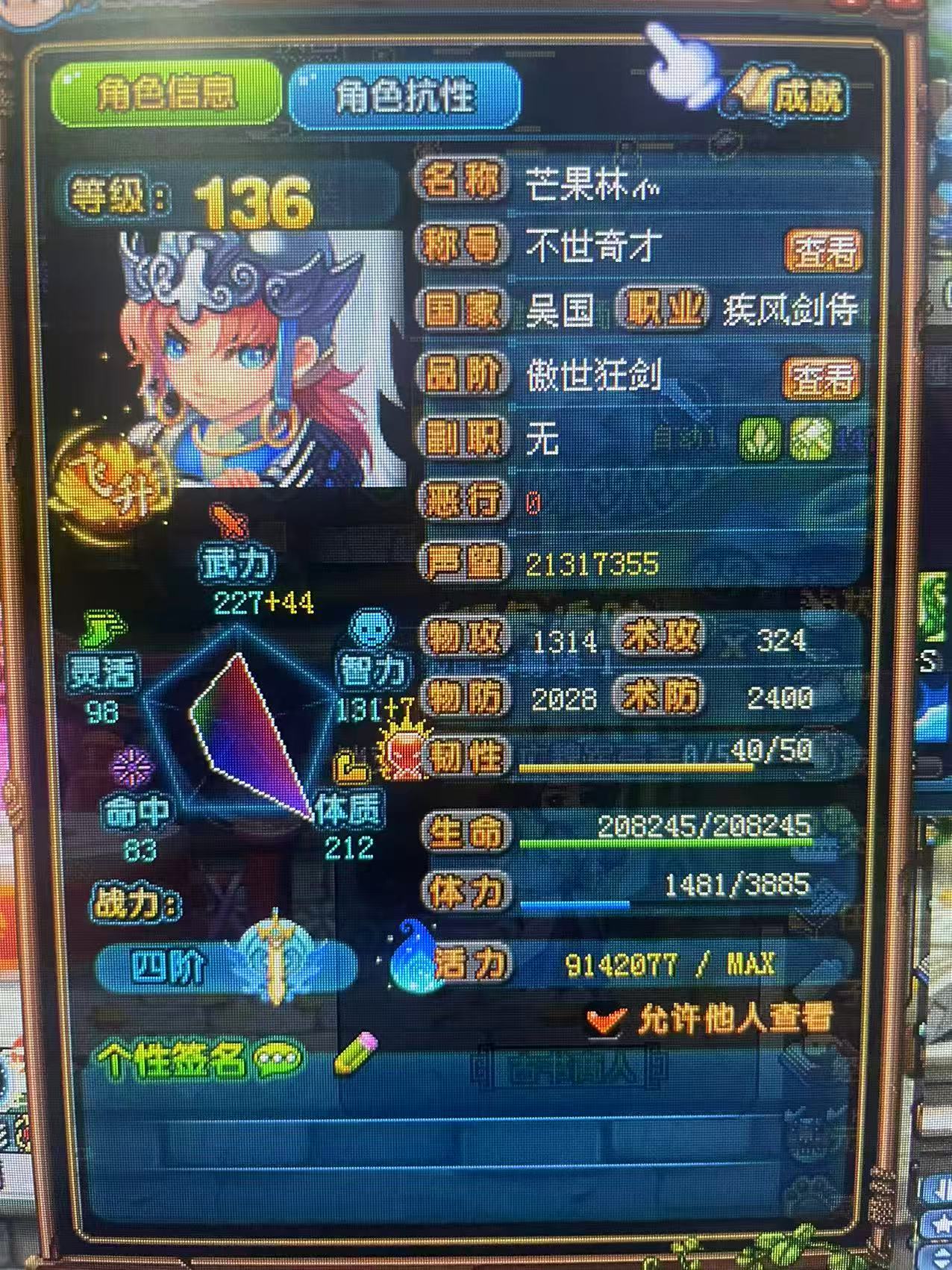 QQ三国SG5498吴国136级男剑侍 武力44 智力 40 初恋微甜 时光轮回 蓝颜 蓝莓 天书61级